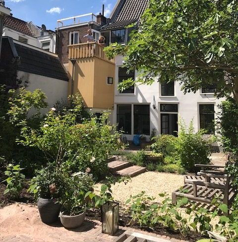 Ruime, besloten binnentuin met verschillende niveaus en terrassen. Het 17de-eeuwse huis is in 1992 grondig gerestaureerd waarbij het zoveel mogelijk in oude staat is teruggebracht. Daarbij heeft het aan de tuinkant bijzondere accenten gekregen in kleuren die bij de restauratie zijn aangetroffen. Een bijzonder element in de tuin is de middeleeuwse zinkput die toen bij toeval werd ontdekt en weer zichtbaar is gemaakt. In 2016 is het huis opnieuw verbouwd waarbij oorspronkelijke elementen zoals plafondbalken in de keuken weer zichtbaar zijn gemaakt.