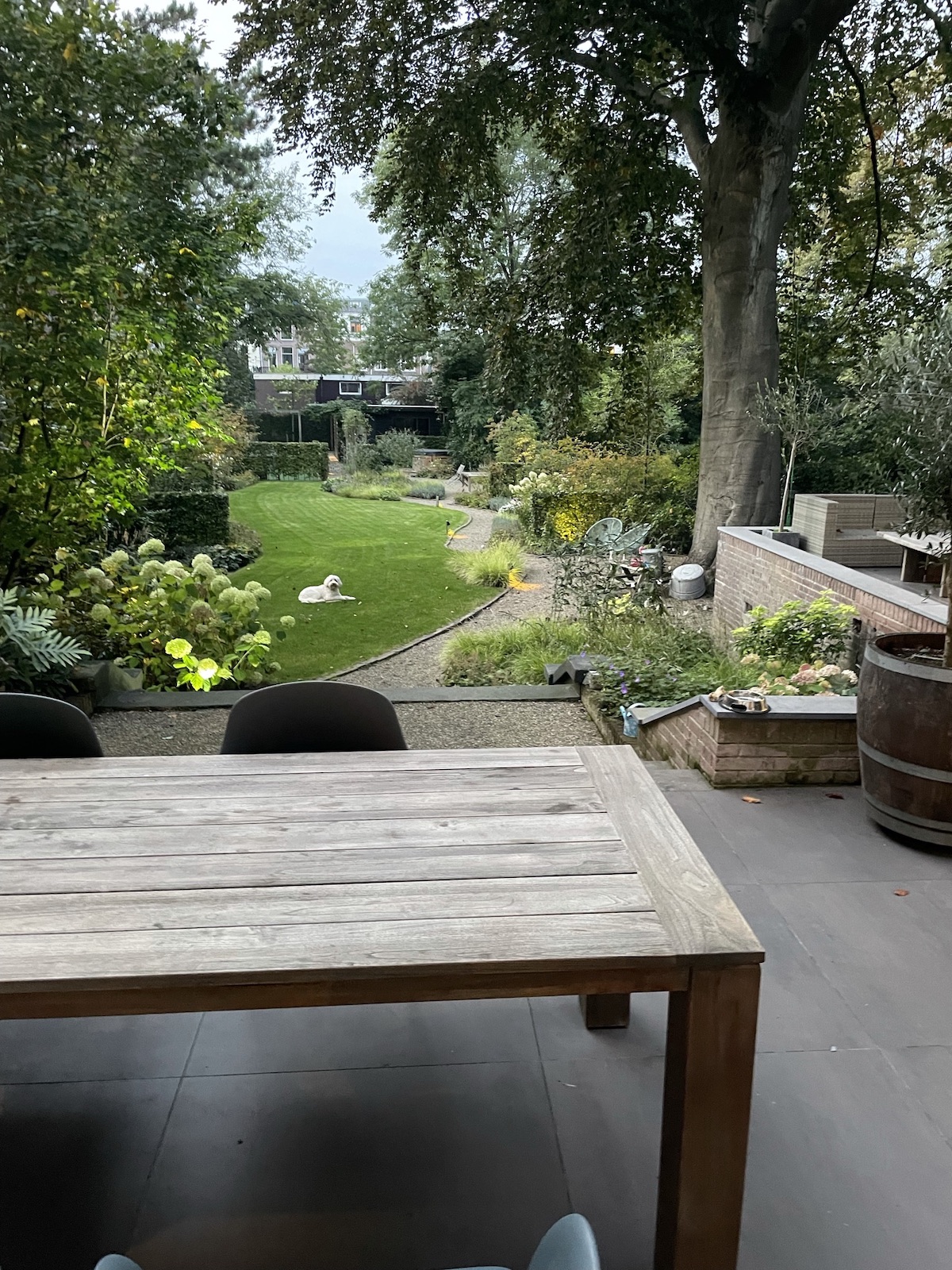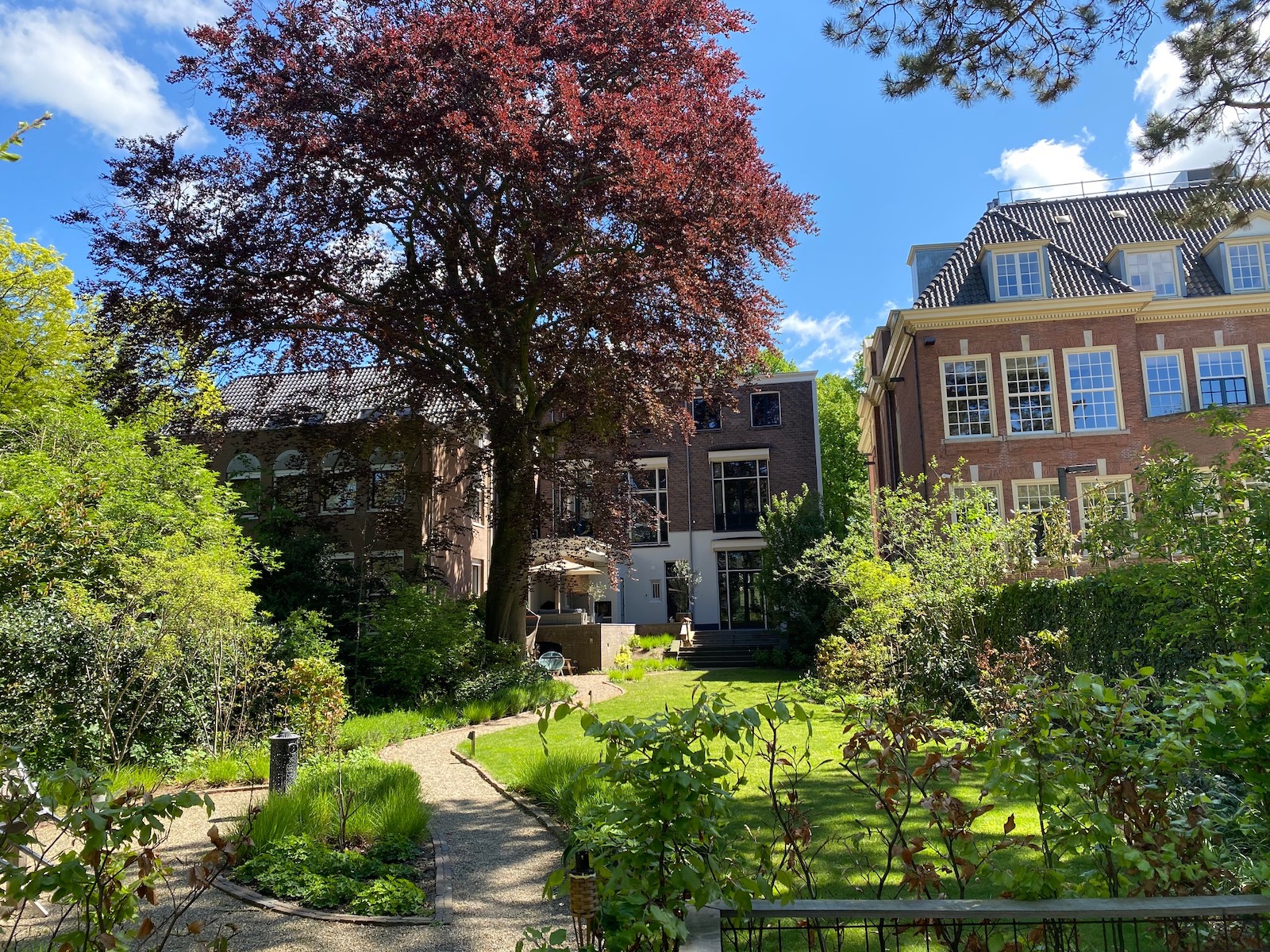 Ondanks de ruimte die tegenwoordig als toegangsweg en parkeergelegenheid in gebruik is, beschikken de bewoners van Maliebaan 10 nog over een zeer diepe tuin waarin ook is voorzien in een groot speelterrein voor de kinderen. De tuin is in 2017 opnieuw aangelegd door het hoveniersbedrijf Cees van Amerongen naar een ontwerp van tuinarchitect Martijn Tillema. Het grote grasveld wordt begrensd door golvende borders en grindpaden, waarbij beukenhaagjes zorgen voor compartimentering. De grote, oude rode beuk bij het huis resteert nog van voor de bouw van het huis.