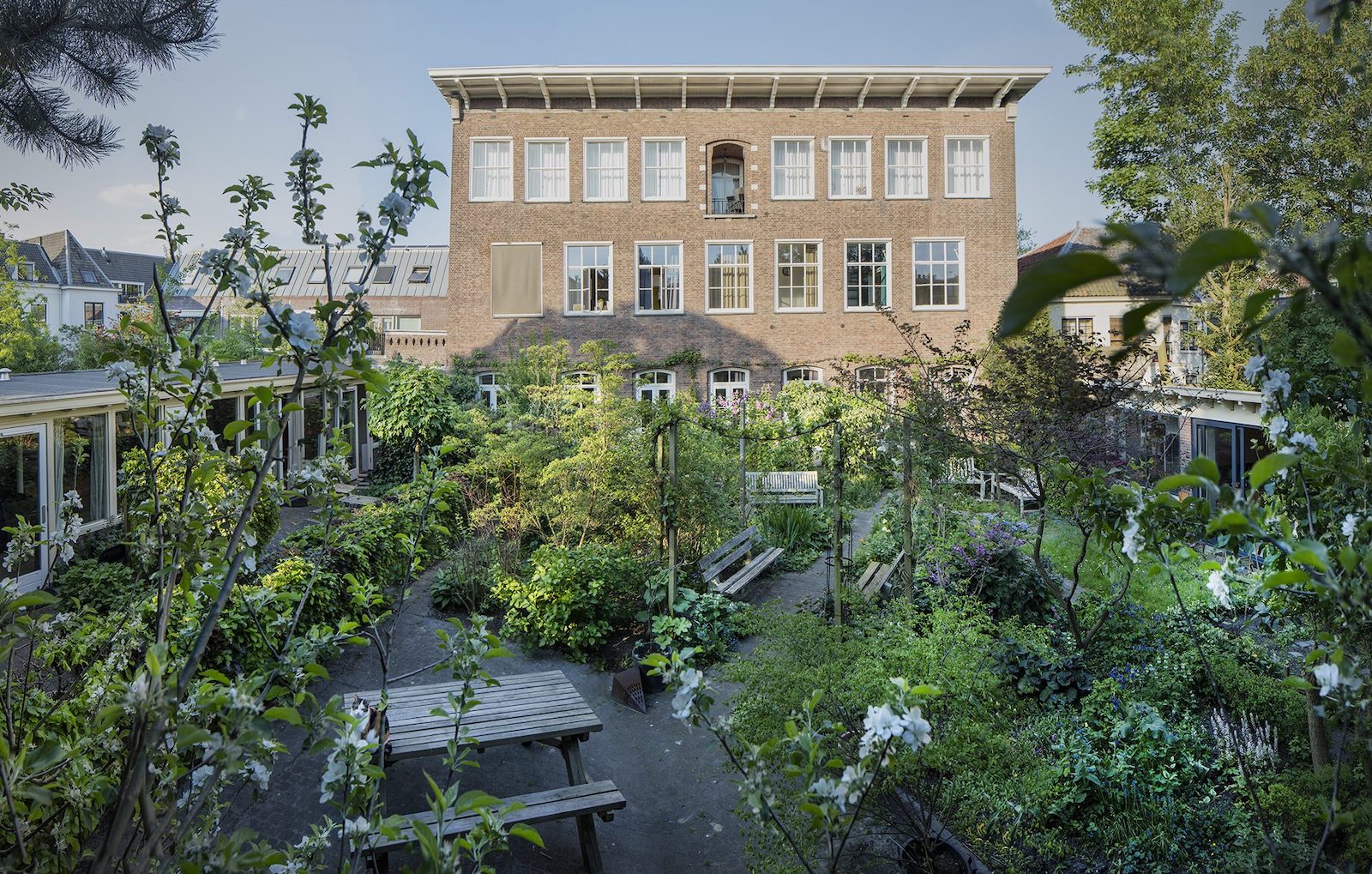 De voormalige rooms-katholieke huishoudschool ‘Maria in den Wijngaard’ werd in 1919 gevestigd aan de Nieuwegracht 56. In 1939 werd de school uitgebreid met het gebouw aan de Nieuwekamp, naar ontwerp van de architecten L. en J.A. van der Laan. De gebouwen werden verbonden door een corridor, die nu nog te zien is in de gemeenschappelijke binnentuin van de tot appartementen verbouwde huishoudschool aan de Nieuwekamp. De woningen die aan de tuin grenzen hebben een eigen tuin, het gemeenschappelijke gedeelte is zodanig ingericht, dat er open ruimtes en meer besloten plekjes zijn. Er is een grote verscheidenheid aan planten en struiken.