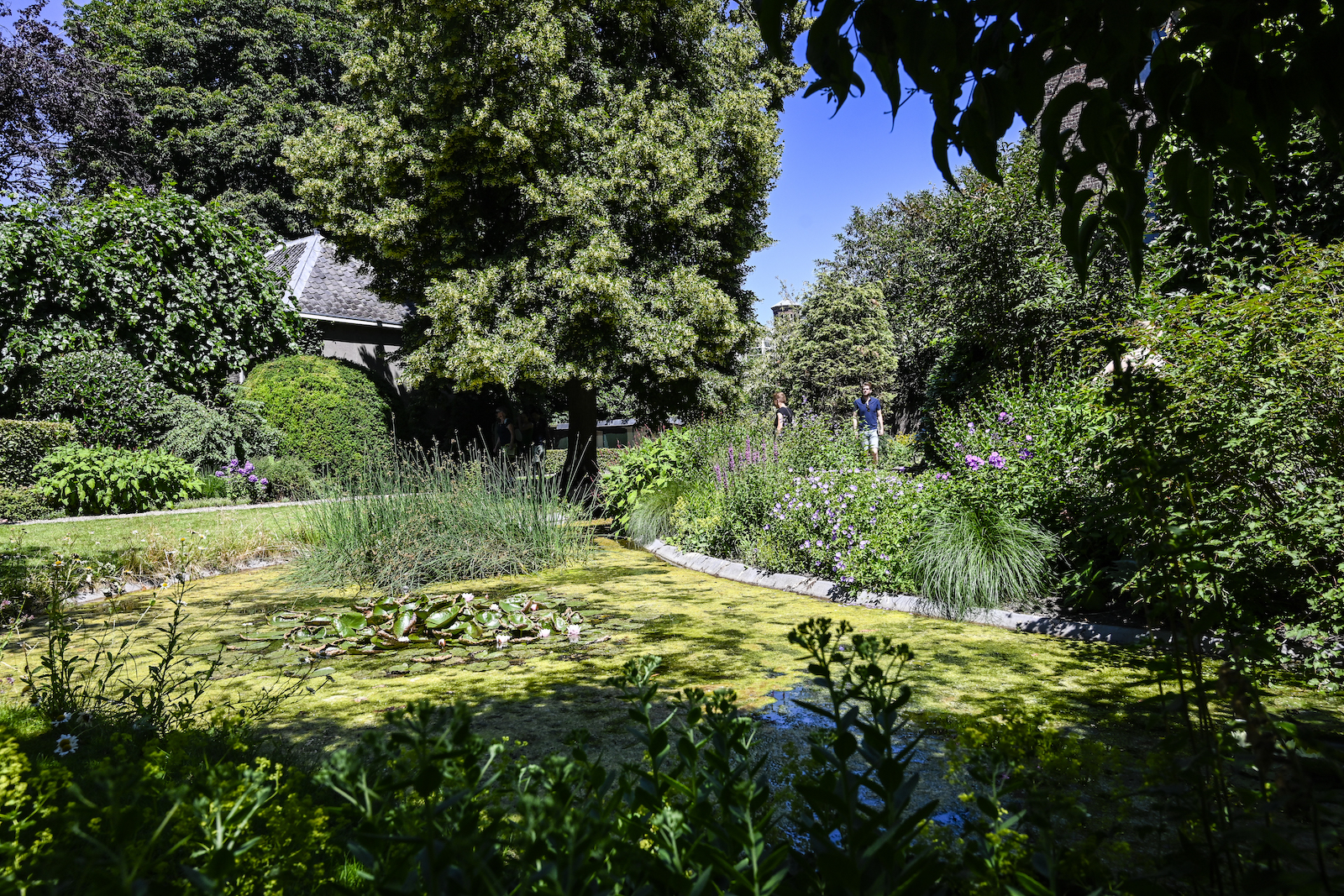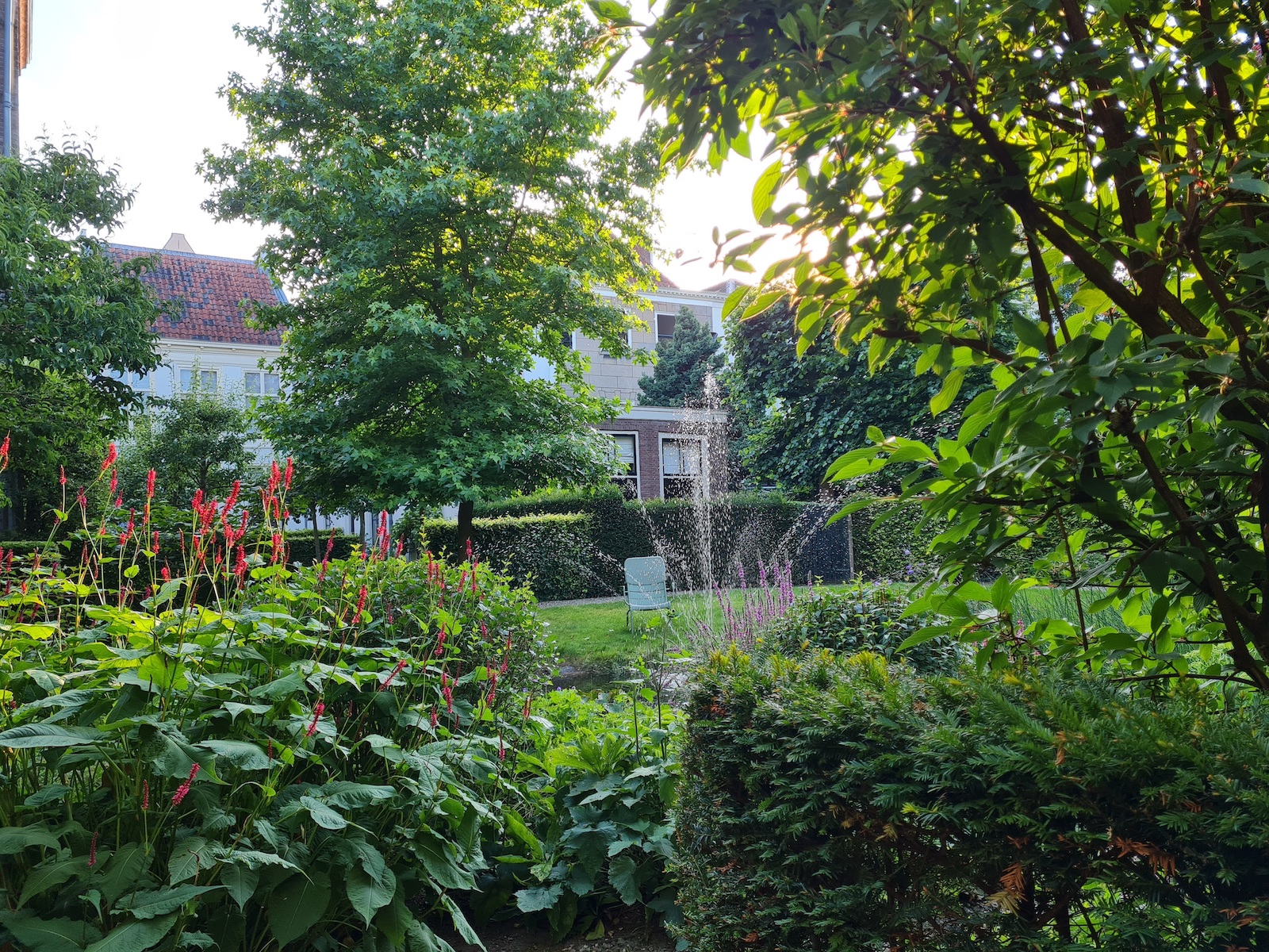 In het midden van de tuin staat een monumentale kastanjeboom die ruim 140 jaar oud is. Het groene poortje rechtsachter geeft toegang tot de Herenstraat: dit diende volgens de fraters als vluchtweg bij erediensten in de St.-Janskapel achterin de naastgelegen tuin van de kanselarij van de Orde van Malta (Nieuwegracht 14). Naast het groene poortje zijn de resten van de apenkooi te zien: het verblijf van de apen die door de fraters uit Afrika waren meegenomen. In de rechterhoek van de tuinmuur is een kleine Mariagrot. Tegen de grote tuinmuur staat een oud kippenhok dat enkele jaren geleden is opgeknapt en nu weer wordt bewoond.